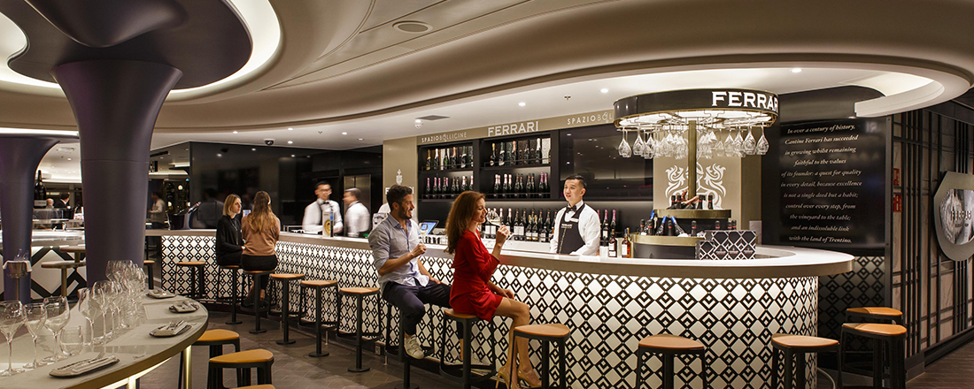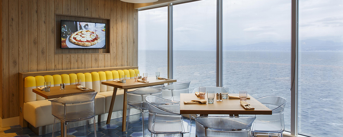 Skibet har 20 dæk, hvoraf dæk 4 til 20 er for passagerer. I forenden, midten og bagenden ligger skibets elevatorer. På dæk 7 finder du reception, udflugtssalg, business center og atrium. På dæk 5 og 6 findes skibets hovedrestauranter med a-la-carte servering. Disse er inkluderet i dit krydstogt. Derudover findes der en masse specialrestauranter ombord, hvor du bl.a. kan få en god steak eller en pizza. På disse restauranter betaler du en merpris.