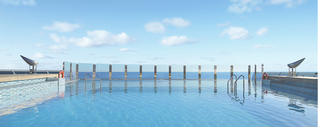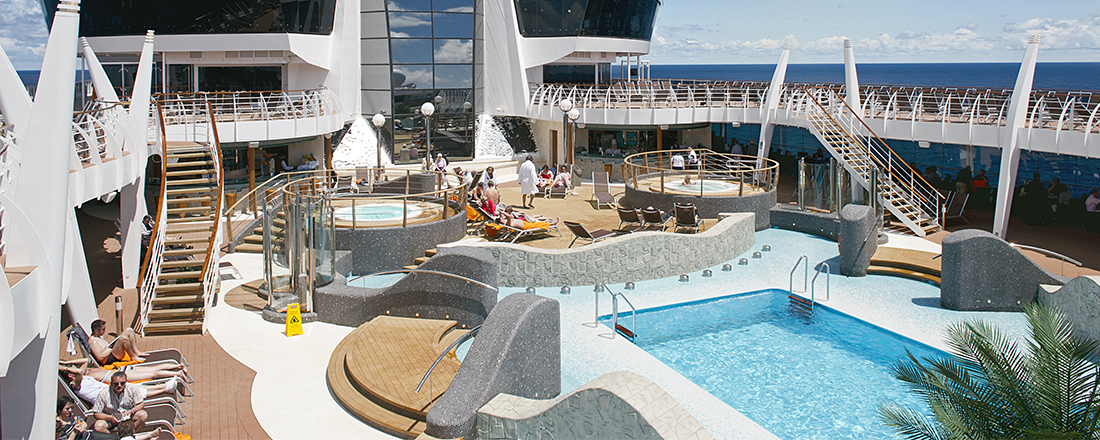 På dæk 14 ligger det indbydende soldæk med pool, aqua park og liggestole samt Triton Bar og Poseidon Bar. I bagenden er den store buffetrestaurant, som også er inklusive i rejsens pris. På dæk 15 er der i bagenden et hyggeligt udendørs barområde med en ekstra pool. På dæk 16 finder du forskellige aktiviteter som F1-simulator, 4D-biograf samt Shuffleboard.
