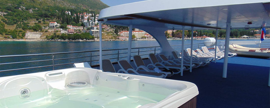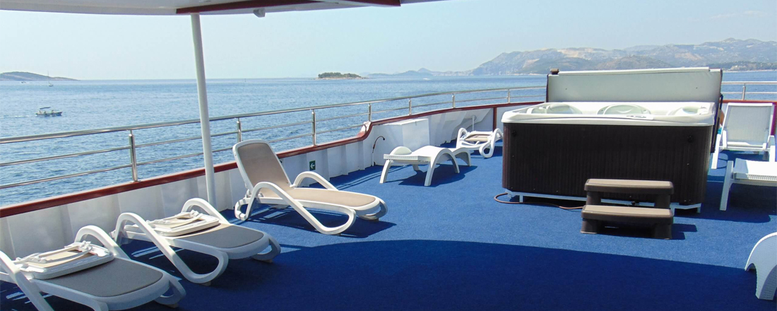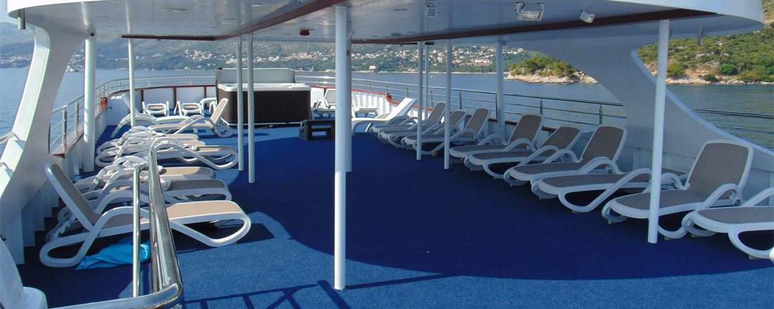 Øverst oppe ligger det 390 m2 store soldæk. På dækket er der en dejlig udendørs jacuzzi samt en masse liggestole. Et skønt sted at nyde solen mens man sejler og kan mærke en let brise. Soldækket har endvidere et antal parasoller. På det øvre dæk ligger skibets airconditionerede salon-restaurant med store panoramavinduer. I det ene hjørne er der morgenbuffet og en bar. Lige ved siden af restauranten ligger endnu en stor terrasse med en vidunderlig udsigt. Terrassen er indrettet som et indbydende og afslappende loungeområde. I tilfælde af meget vind kan området dækkes til. Bagpå skibet er der udstyret med en lille svømmeplatform med 2 stige, udendørs bruser og toiletter. Det bliver ikke nemmere at tage en dukkert. Strandhåndklæder kan lejes ombord.