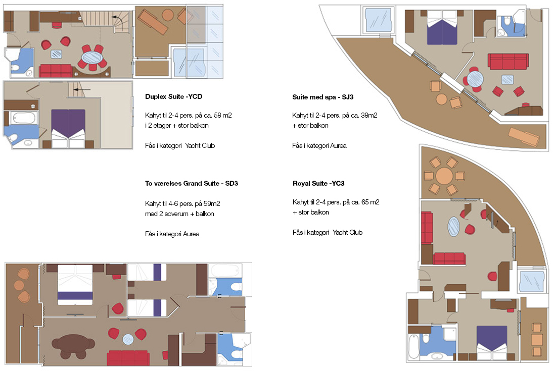 Yacht Club kahytterne fåes i flere udgaver og størrelser. De er alle større end de bedste balkon kahytter. De er mere elegant indrettede og der er flere finesser og faciliteter.