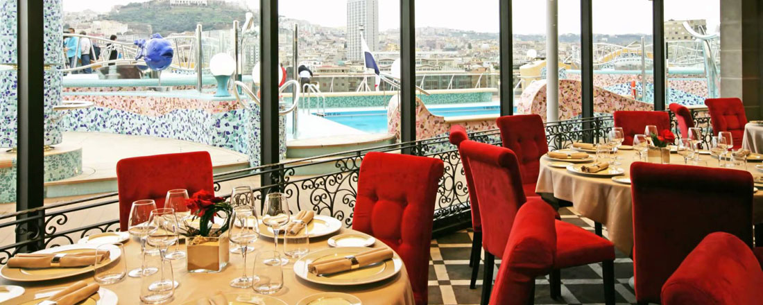 Hver aften præsenteres man for lækkert a-la-carte menukort hvor maden også er hævet en standard over det generelle niveau. Det er lækre gourmetretter og i løbet af uges ses både store bøffer og de flotteste hummer. Der er selvfølgelig ægte High Tea om eftermiddagen. Yacht Club har skibets bedste placering. Øverst i front med den smukkeste udsigt ligger lounge baren. Det er også her man finder privat pool dæk området. Her er liggestolene lige en tand bedre og området lidt mere eksklusivt. Servicen er i top. Der er fri adgang til Aurea Spa såfremt kroppen har interesse i dette Også det ligger lige i nærheden. Lad evt. butlerend sørge for tidsbestilling.