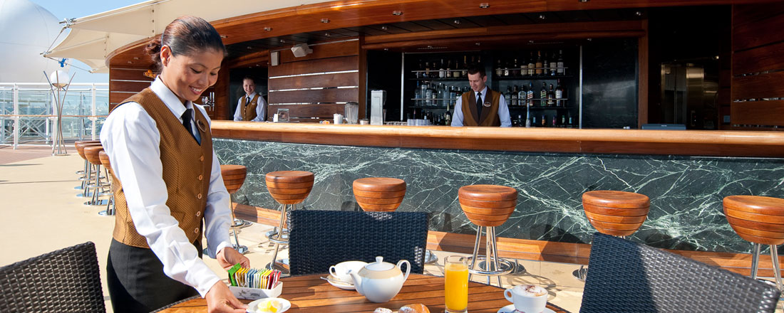 Det starter allerede ved Check In, hvor der er et special Priority område til Check in. Her serveres et glas vin mens alt gøres klar til at komme ombord. Herefter bliver man fulgt til sin elegante kahyt af sin personlige butler. Butler-service er en del af din luksus under dit cruise. Yacht Club tilbyder sine gæster en lang række private og unikke faciliteter, som kun kan benyttes hvis man er Yach Club gæst. F.eks. kan du nyde solen stråler og den storslåede udsigt fra den eksklusive Top Sail Lounge. Nyd en dukkert i poolen eller slap af et af dækkets boblebade med en god drink i hånden fra poolbaren.