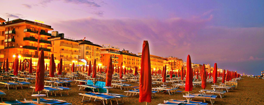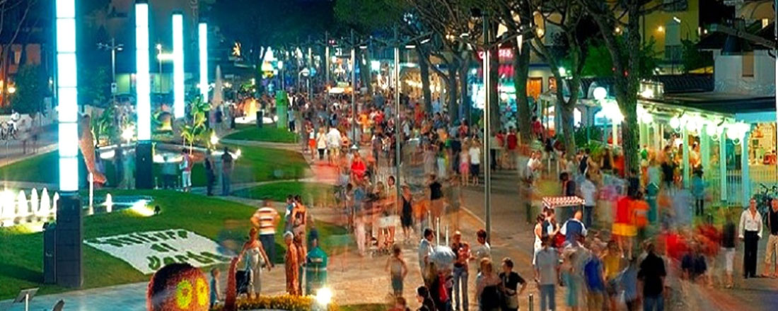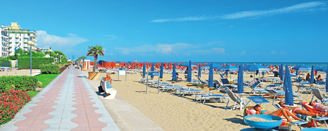 Byen ligger ud til Adriaterhavet, kun 30 km. fra Venedig. Den 16 kilometer lange fintkornede sandstrand er det store trækplaster og er på det seneste udvidet med en flot promenade. Parallel med stranden ligger hovedgaden, som om aftenen forvandles til én stor gågade med en livlig og hyggelig atmosfære. Her er et uoverskueligt antal af fristende butikker, små hyggelige caféer og romantiske restauranter. Ligeledes er der barer i hobetal, alt sammen kombineret med den perfekte feriestemning. Og husk så, at hoteller og lejligheder stort set alle sammen, har gratis liggestole og parasoller på stranden.