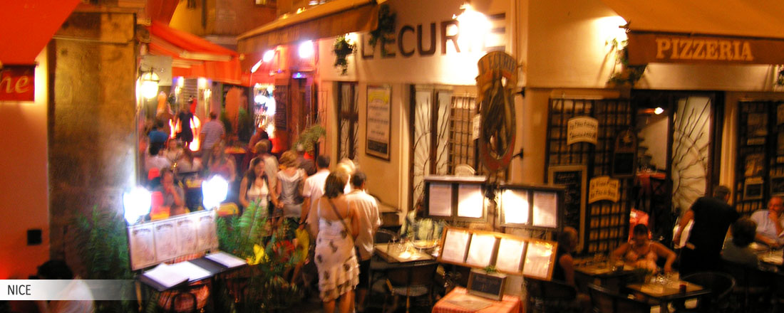 Der er mange lækre restauranter i Nice. Ved strandpromenaden ligger en række gode restauranter, hvor du kan nyde havudsigten mens du spiser. Også i den gamle charmerende bydel, ligger der et stort udbud af tiltalende spisesteder, barer og natklubber. De pastelfarvede huse med røde tagsten, hvor du virkelig kan fornemme den summende Middelhavsstemning.