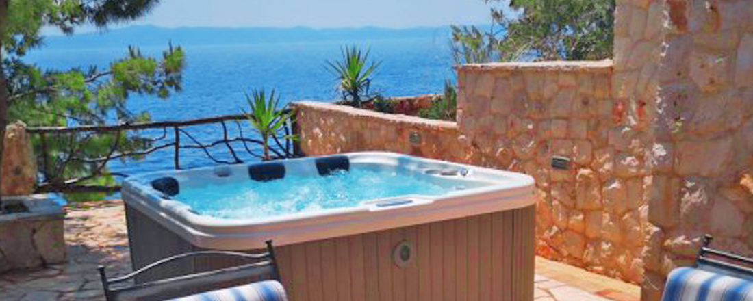 Men når man bor så naturskønt vil en stor del af livet foregå udendørs. Her er der en 180m2 terrasse hvoraf der 35m2 er overdækket terrasse med skygge og evt. ly for en tordenbyge. Terrassen er udstyret med havemøbler, grill og en skøn skøn Jacuzzi. Næsten uanset hvor man sidder er der en fantastisk udsigt og omkring 1 minuts gang til vandet. Villaen har parkering lige ved huset. Der er mulighed for at medbringe en hund ved forudforespørgsel (gratis). Hele huset har aircondition, gulv- og centralvarmesystem, samt wifi. Al elektricitet kommer fra solceller og i tilfælde af færre solskinsdage, er der også en generator. Bemærk - villaen har ikke pool.