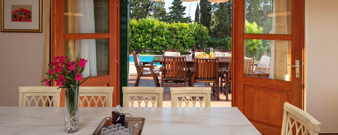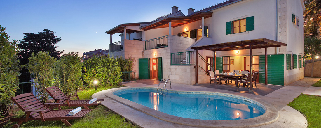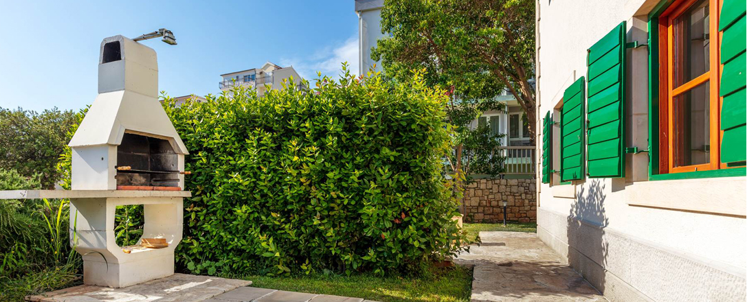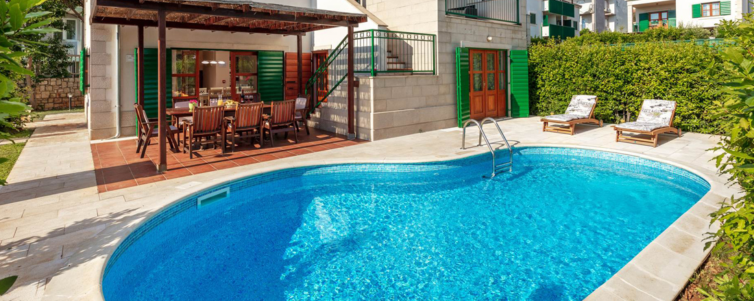 Med så vidunderlig en beliggenhed tæt på strand og vand vil en stor del af livet foregå udendørs. Her ligger en dejlig have med en overdækket terrasse mod syd. Herunder står et spisebord til 8 personer så man kan nyde måltiderne ude. Til den ene side er der en ægte kroatisk grill som er til fri afbenyttelse. Foran terrassen ligger ved hver villa en dejlig pool på 24m2 og som er ca. 1,40 m dyb. Rundt om poolen er der et liggestole. Der er badehåndklæder inkl. - disse skiftes 1 gang ugentlig. Villaen har en parkering tæt ved huset. Der er mulighed for at medbringe en hund ved forudforespørgsel (max 2 kg). Hele huset har aircondition, centralvarmesystem, samt wifi. Check in foregår på nærliggende Aparthotel Pharia.