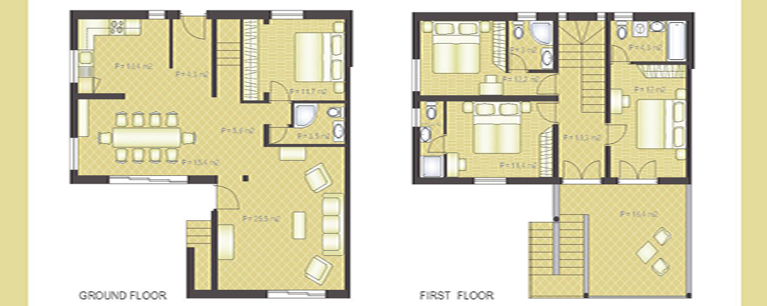 Villa Liza og Villa Dane ligger i anden række fra havet. Villaerne er fra 2007 og er på 157m2. og med fin plads til 8 personer. Husene er i 2 etager, og fra 1 sal kan man se havet fra den hyggelig overdækkede balkon. I stueetagen er der et veludstyret køkken bl.a. med spiseplads, en opholdstue med DVD afspiller og TV, et lille toilet og et dobbeltværelse. Fra både spisestuen og stuen kan der åbnes nogle store franske terrassedøre så man får udelivet og indelivet til at smelte sammen. Der er adgang til 1. sal både udefra og indefra. På 1. sal er der yderligere 3 dobbeltværelser - alle med eget bad/toilet. Herfra er der også en dejlig balkon med udsigt. Køkkenet er udstyret med kogeplader, ovn, køleskab med fryser, opvaskemaskine, mikroovn og kaffemaskine.