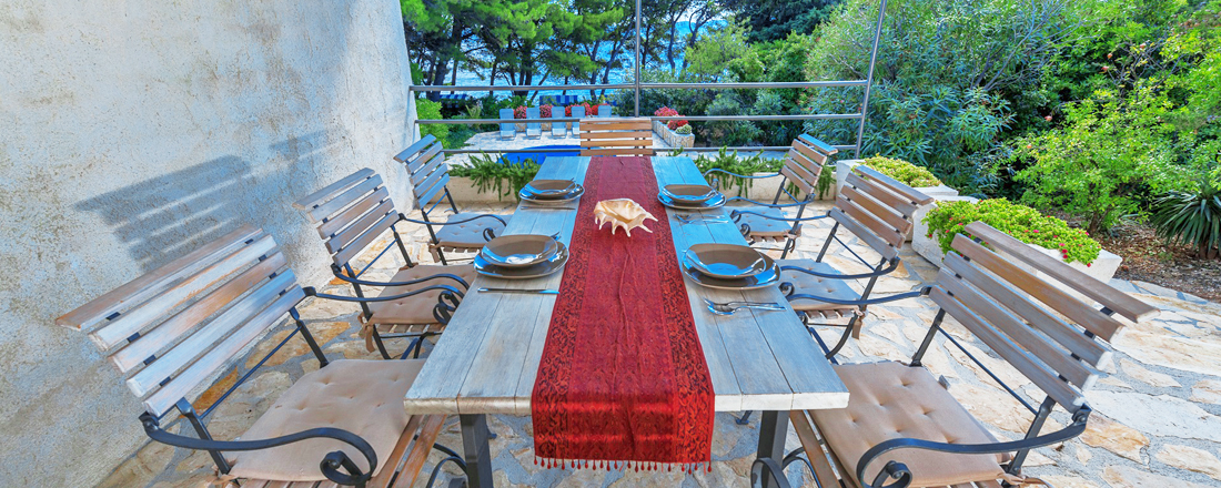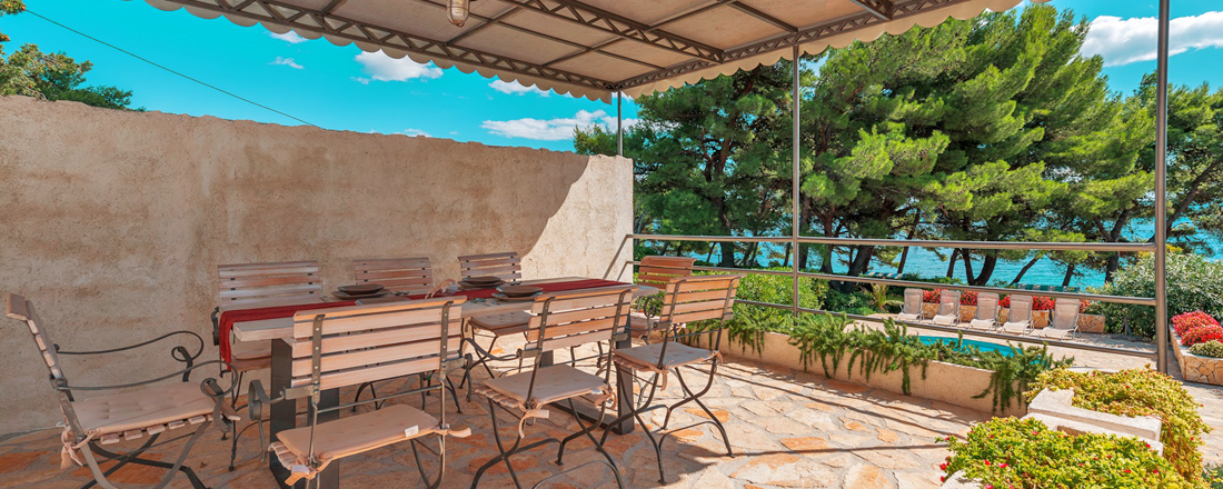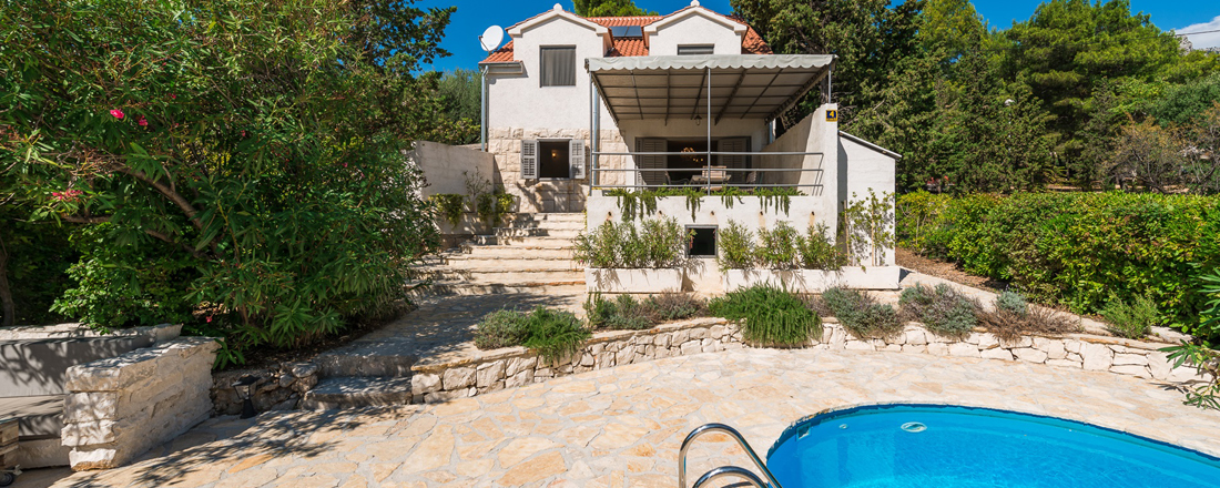 Få villaer kan brøste sig af en så fantastisk beliggenhed - direkte ud til strandpromenaden og havet. Samtidg tager det et minut at gå til byen og max 10-12 minutter at gå til eventyrstranden Zlatny Rat. Huset ligger på en 600m2 stor grund som er anlagt i 2 etager. Øverst ligger en overdækket terrasse med adgang til stueetagen. 10-12 trin nede ligger den store terrasse med poolområdet, liggestole og hyggekrog. Haven er hyggelig omkrandset af træer og buske og der går en lille sti ned til vandet. Der er sengelinned og håndklæder inkl. - disse skiftes 1 gang ugentlig. Villaen har en parkeringsplads. Der er mulighed for at medbringe en hund ved forudforespørgsel. Hele huset har aircondition, centralvarmesystem, samt wifi.