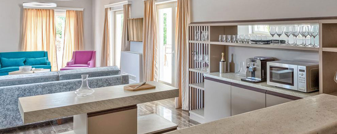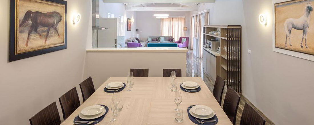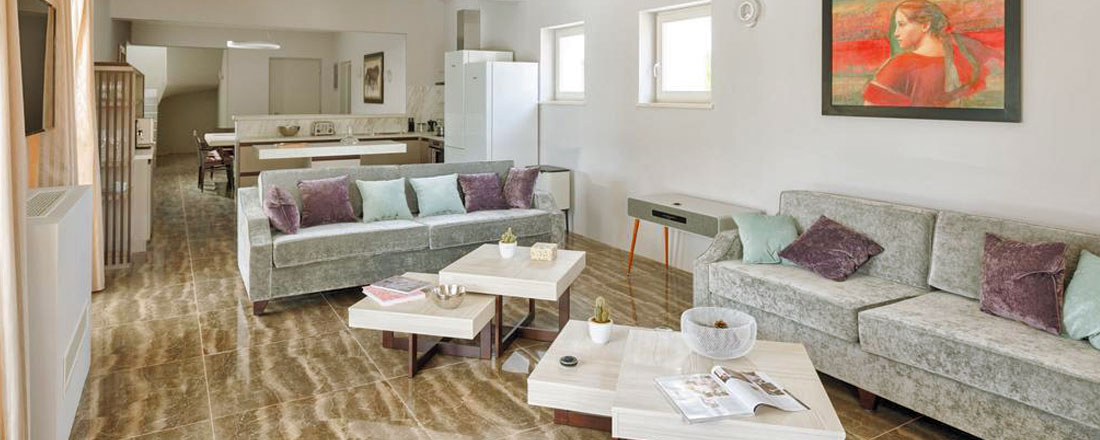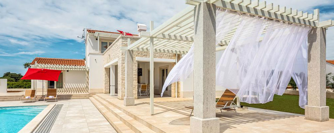 Villa Sole har et boligareal på 300m2 og passer til max 10 personer. Huset er indrettet i klassisk moderne stil med bjælkelofter og specialdesignet møbler. Køkkenet er veludstyret med alle moderne bekvemmeligheder, bl.a. kaffemaskine, opvaskemaskine og mikroovn. Den store opholdsstue er møbleret med signaturmøbler, der er unikke for Villa Sole. Fra stuen er der direkte udgang til stor overdækket terrasse med med et stort spisebord. Herfra har man udsigt over poolen og den 350m2 store terrasse. Terrassen er i elegant stil med typiske kroatiske sten. Her er også muligt at grille i den åbne grillovn. Overalt i huset er der aircondition og opvarmning.